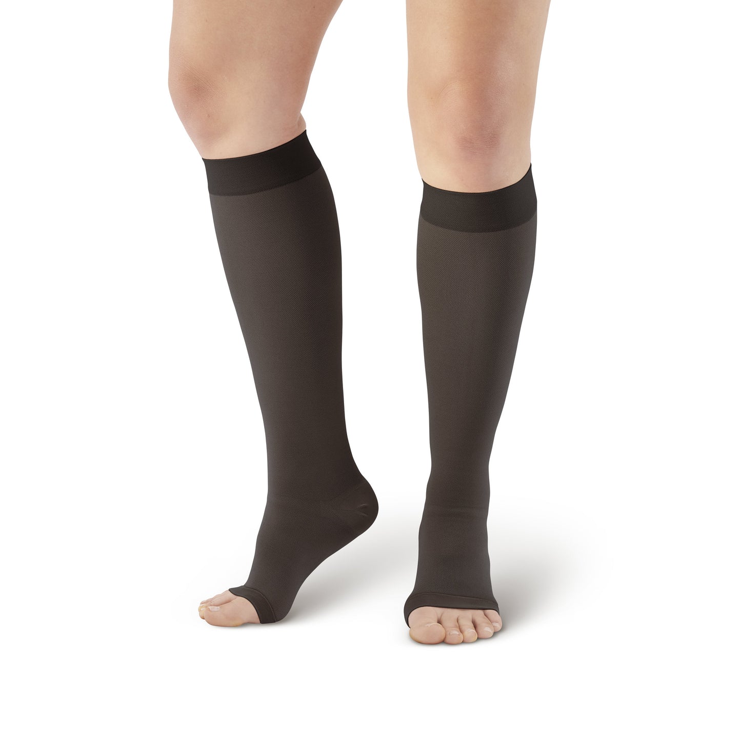 Get the medical-grade support you need with the breathable comfort you want. The Ames Walker Style 201 Open Toe Knee Highs provide firm 20–30 mmHg compression to help manage swelling, varicose veins, and symptoms of DVT—all while offering a sleek, opaque finish that conceals skin imperfections. Designed with an open toe and reinforced heel, these stockings deliver comfort, durability, and flexibility for everyday wear.