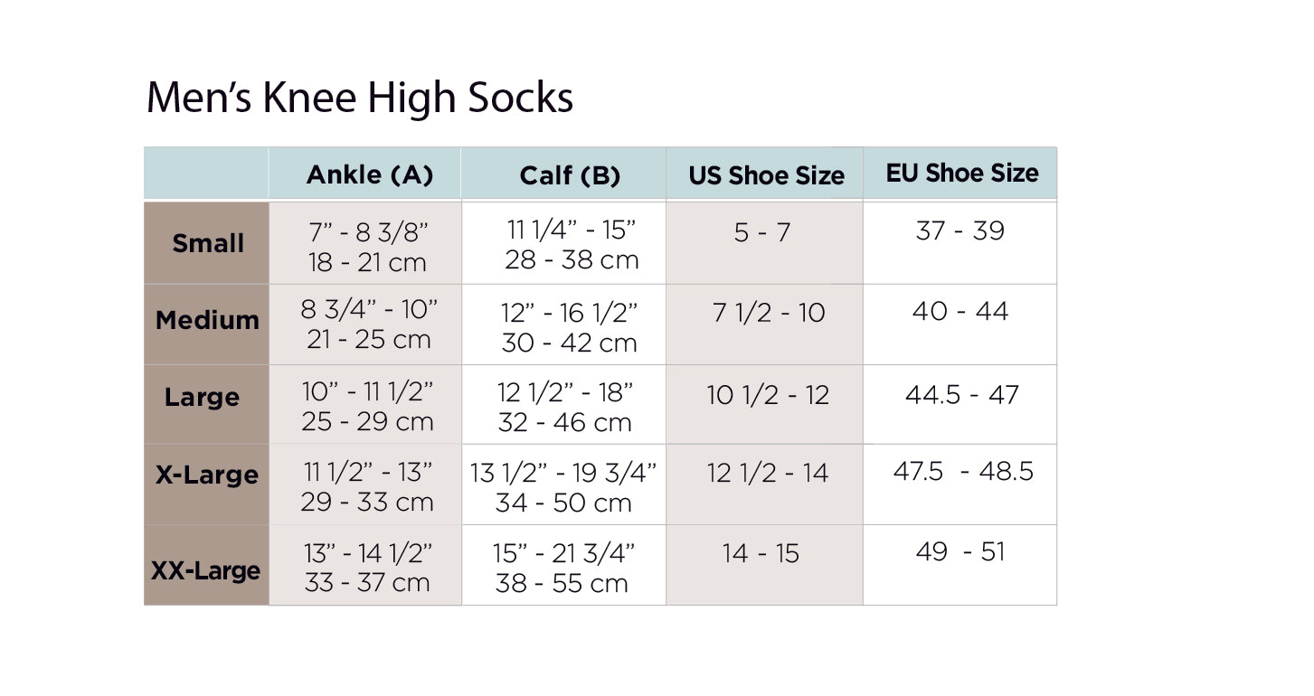 *Sizing for graduated compression socks, stockings & armsleeves differs significantly from typical sizing, and is based on precise measurements. Each brand also varies. To ensure you are ordering the correct size for you, please refer to the size chart for this specific product before making your selection.
