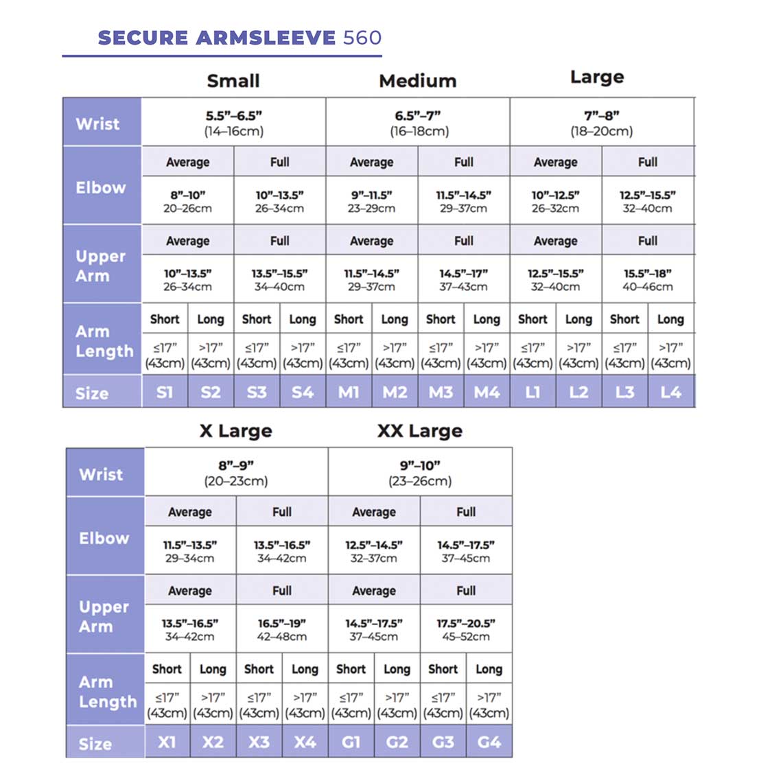 The Sigvaris Secure Armsleeve ensures strong containment for lymphedema, management of post-surgical edema and general edema. The high modules in-lay yarns maintain a proper limb profile and provide containment where you need it most. The unique sizing system allows for minimal garment fatigue while the double-covered yarns ensure no bare spandex is touching the skin. The secure grip-top dot band is breathable for comfortable wear and appropriate for sensitive skin!