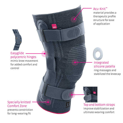 The Genumedi Pro Knee Brace is anatomically tailored support for your knees. With an integrated silicone patella support ring and the polycentric-hinged uprights, this brace will help keep you going! The specially designed inner support ring pocket helps support and control the patella while reducing direct pressure on the patella. The anti-migration silicone beaded stays and comfort zones are unique to the Genumedi Pro brace, to produce compliance-enhancing performance.