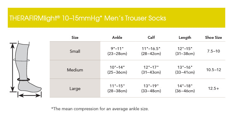 Therafirm Light Support 10-15 mmHg Men's Trouser Socks These stylish men's dress socks feature an over-the-calf, wide ribbed style with a non-binding, knit-in band that holds the socks in place all day.