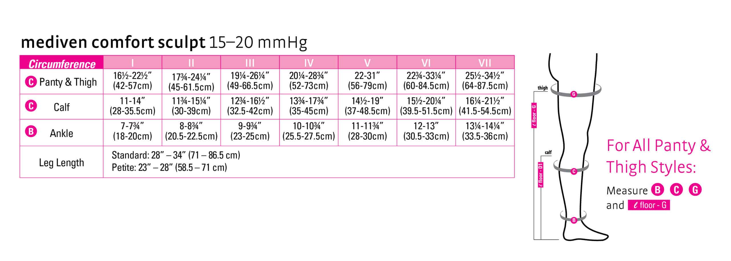 Mediven Comfort Sculpt 15-20mmHg Panty & Thigh Styles Size Chart