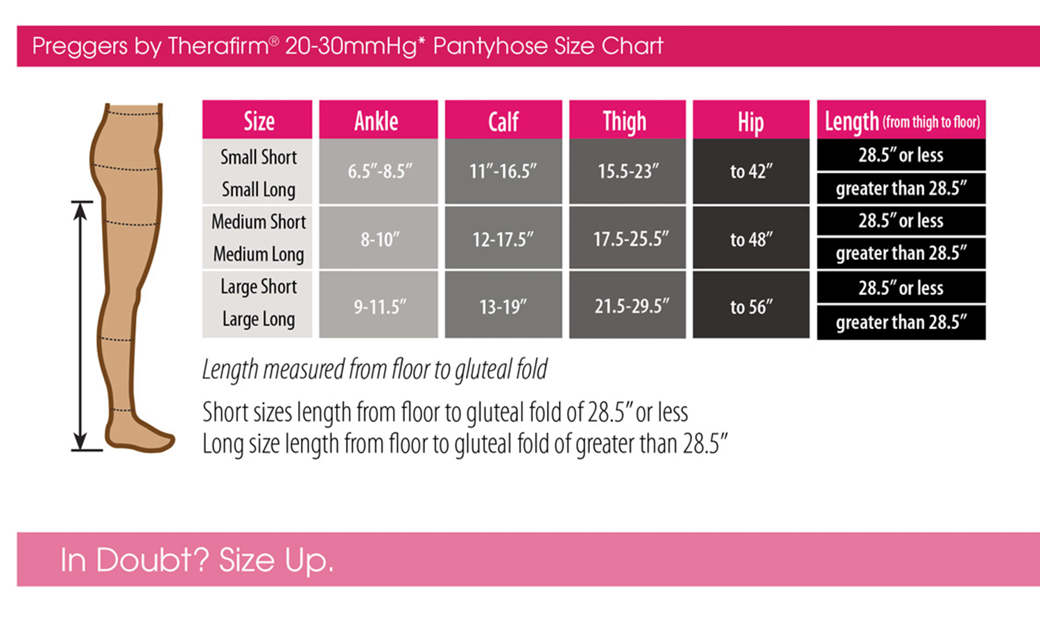 Preggers by Therafirm Maternity Pantyhose - 20-30 mmHg New Preggers maternity pantyhose with more support! Preggers by Therafirm pantyhose are designed to help prevent mild to moderate swelling and relieve tired, achy legs and feet. Made with breathable fibers that provide shaping support and featuring a soft knit-in waistband to prevent rolling and enhance comfort. Reinforced toe for durability. Lycra and nylon blend. A great option for those looking for maternity pantyhose. Preggers by Therafirm Mild Support Maternity Pantyhose are made with a graduated support level of 20-30 mmHg.