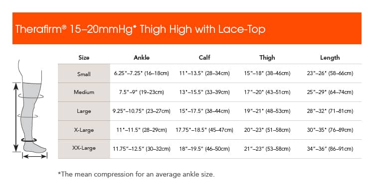 Therafirm Mild Support 15-20mmHg Women's Thigh-High Lace Top Stockings Designed to help relieve minor ankle or leg swelling, minor varicosities, and leg fatigue. Over-the-knee style stockings feature a non-restrictive lace-top band with silicone border to keep stockings in place, no garter belt or adhesive required. Reinforced toe and heel for durability. Designed to help relieve minor ankle and leg swelling, minor varicosities, and leg fatigue. Sheer, two-way stretch nylon and spandex.