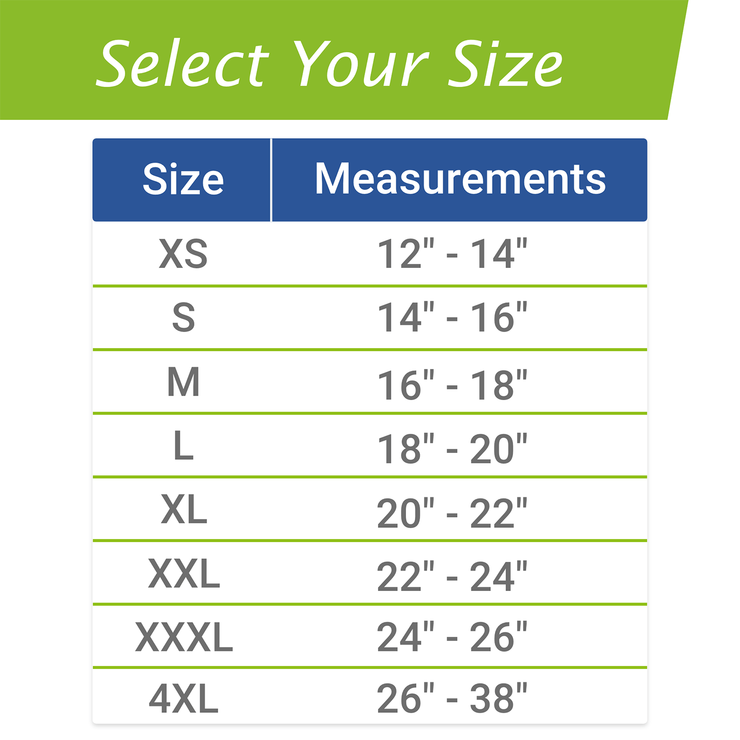 To choose the correct size, sit on the edge of a chair, bend your knee at a 120° angle and measure the circumference of your thigh 4″ up from the middle of your kneecap.