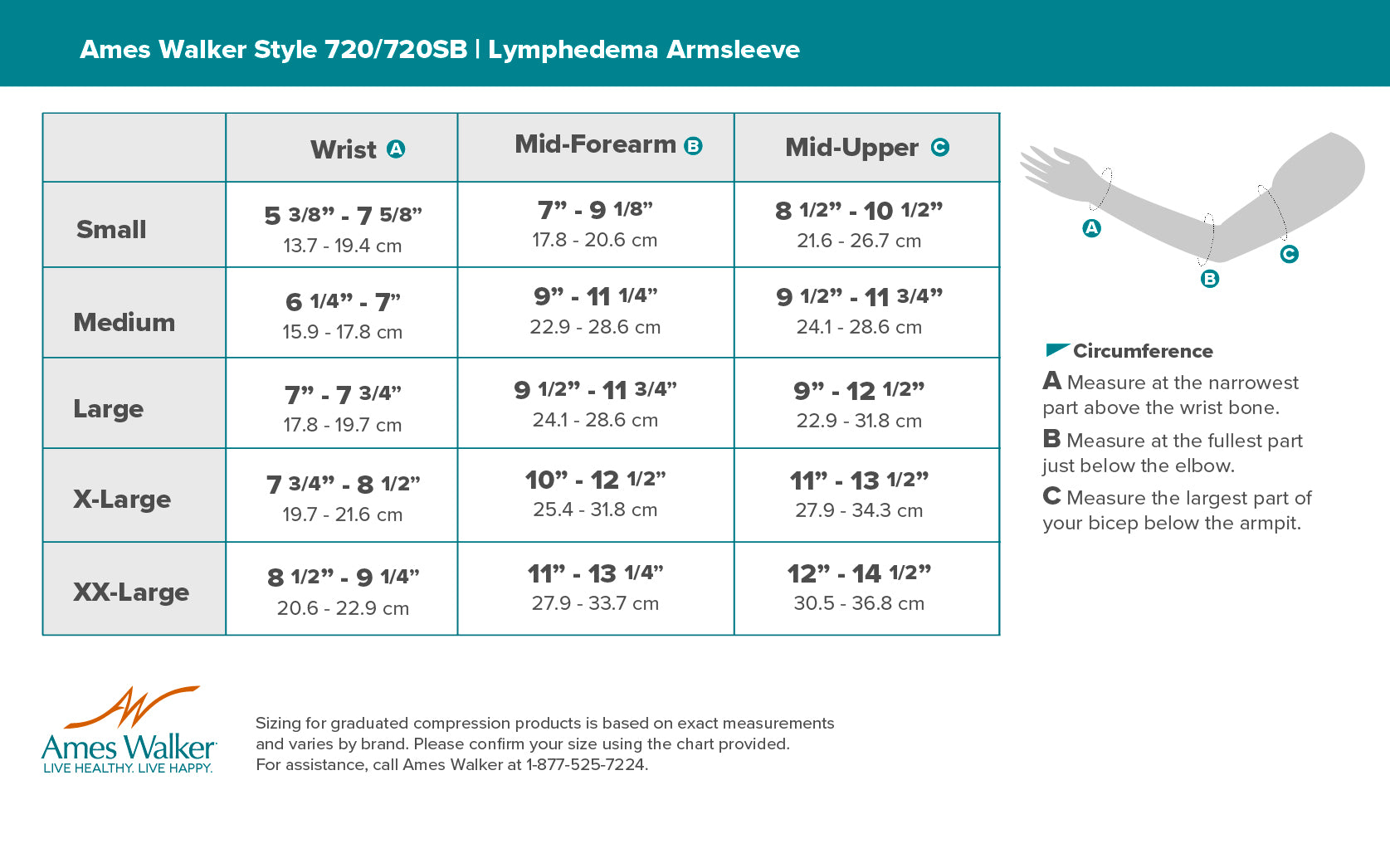 The Ames Walker Style 720 Armsleeve without Gauntlet delivers targeted compression therapy to help manage swelling and discomfort associated with lymphedema. Ideal for post-mastectomy recovery or chronic arm edema, this sleeve offers the support you need with the comfort and discretion you want. Made in the USA and built to last, it’s an excellent choice for everyday compression therapy.