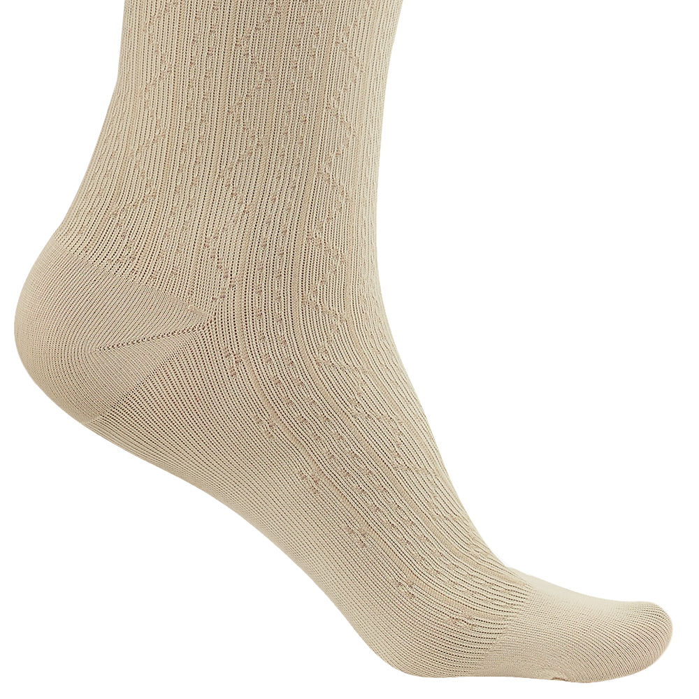 Ames Walker Women's Moderate Compression Support Patterned Dress Socks offer 15-20 mmHg compression with a stylish, knitted diamond pattern. Made from soft microfiber nylon, these socks combine fashion and comfort for a perfect fit. With the same great compression and durability as our Style 110, they provide a sleek look and excellent support, making them a must-have addition to your wardrobe
