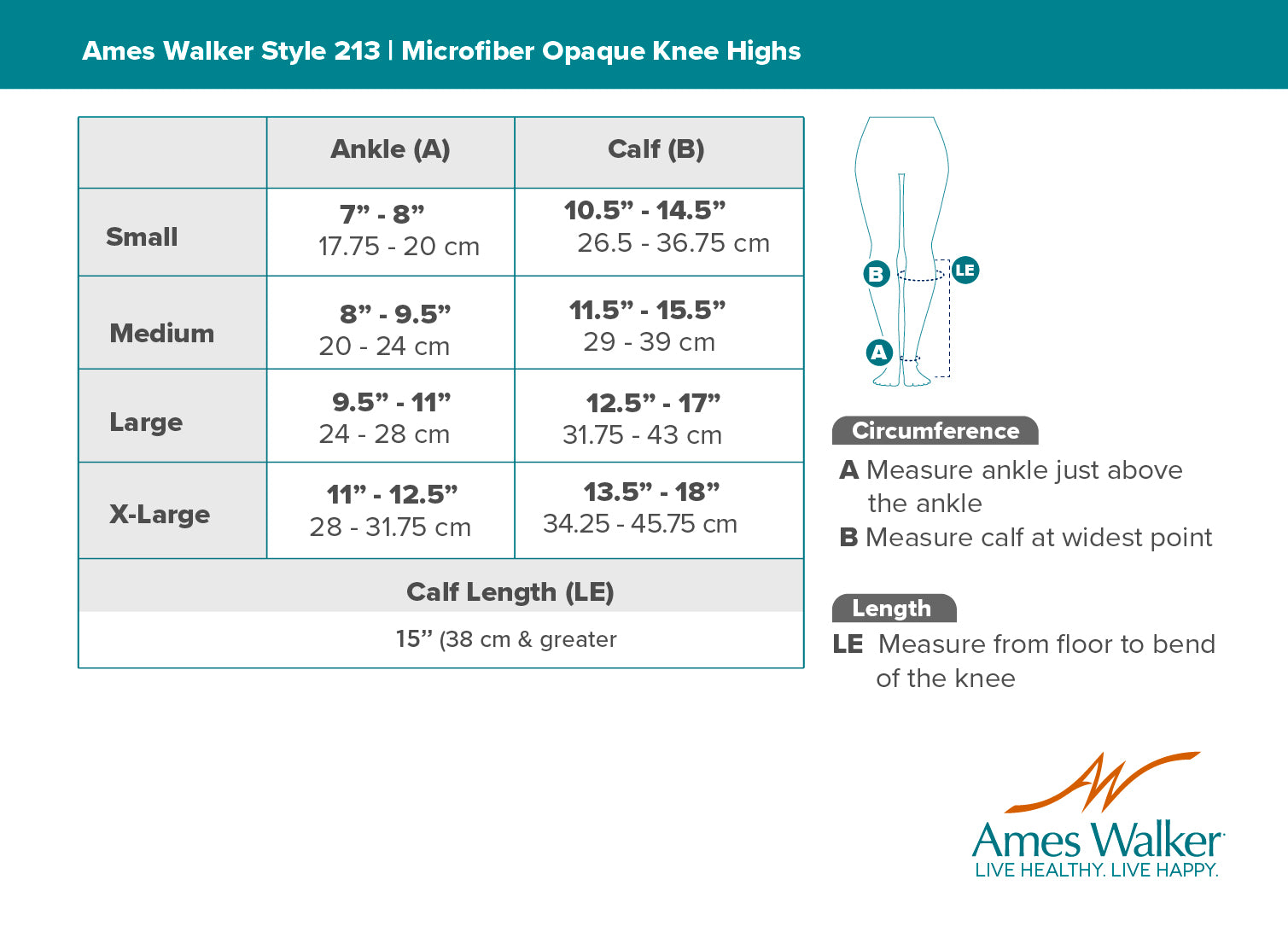 Our Ames Walker Style 213 Microfiber Knee Highs combine sophisticated microfiber nylon with firm 20–30 mmHg graduated compression in a smooth, opaque design. The open toe adds versatility and breathability, making these stockings ideal for everyday therapeutic use. This compression is clinically proven to alleviate leg discomfort, swelling, and symptoms of mild varicose veins, they are also effective for post-sclerotherapy treatment. With reinforced heels for durability and proudly made in the USA, these knee highs provide comfortable, dependable compression support.