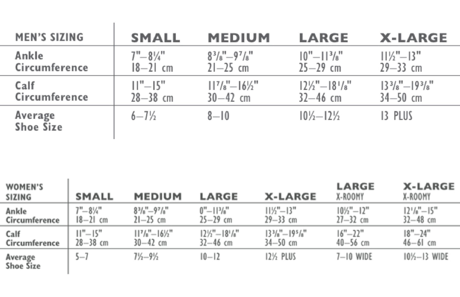 *Sizing for graduated compression socks, stockings & armsleeves differs significantly from typical sizing, and is based on precise measurements. Each brand also varies. To ensure you are ordering the correct size for you, please refer to the size chart for this specific product before making your selection.