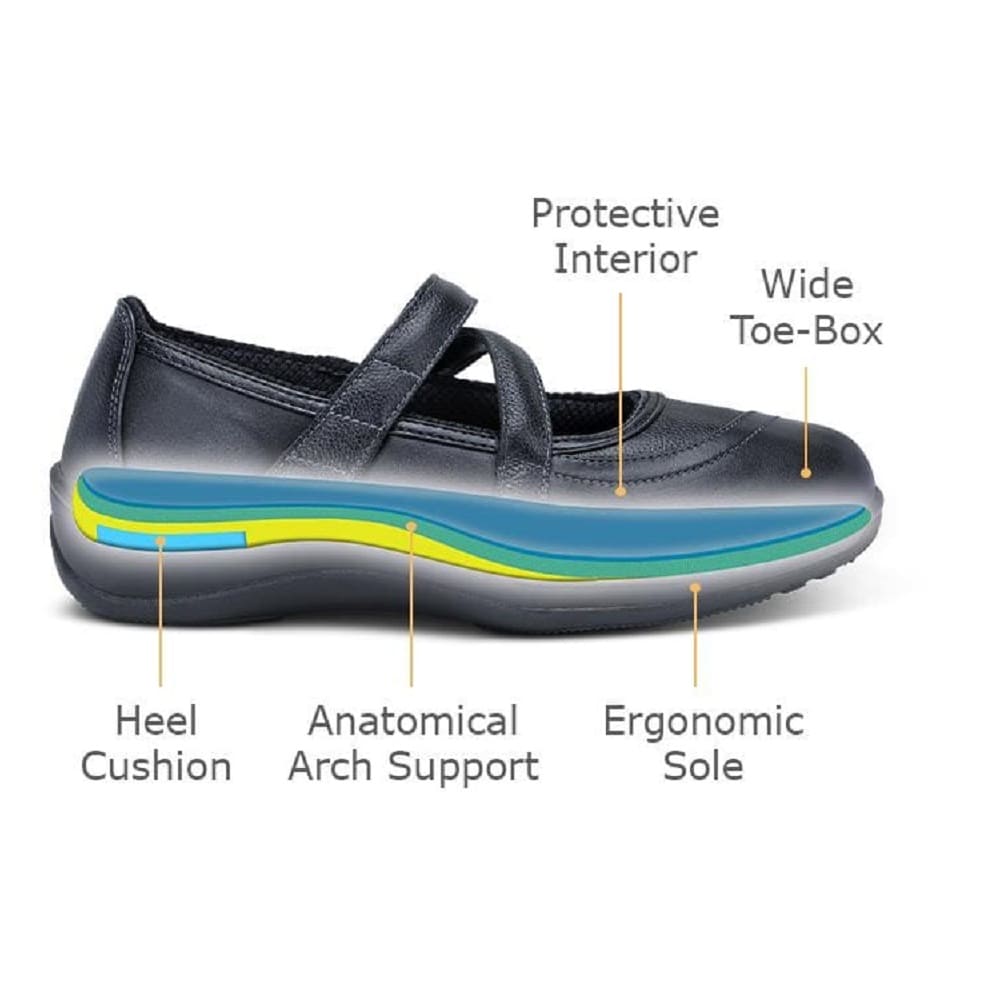 Orthofeet's Celina Mary Jane Dress Shoes, designed with a unique strap that provides extra instep support and a feminine look.
