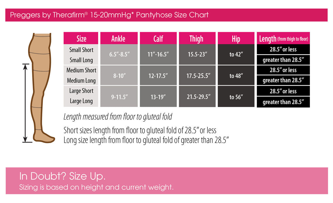Preggers by Therafirm Maternity Pantyhose - 15-20 mmHg New Preggers maternity pantyhose with more support! Preggers by Therafirm pantyhose are designed to help prevent mild to moderate swelling and relieve tired, achy legs and feet. Made with breathable fibers that provide shaping support and featuring a soft knit-in waistband to prevent rolling and enhance comfort. Reinforced toe for durability. Lycra and nylon blend. A great option for those looking for maternity pantyhose. Preggers by Therafirm Mild Support Maternity Pantyhose are made with a graduated support level of 15-20 mmHg.