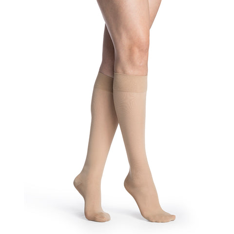 The Sigvaris Midsheer Women's Closed Toe Knee Highs offer semi-transparency and an elegant appearance! The energizing 20-30 mmHg compression is easy to put on and take off in this product, due to the luxurious feel of the double-covered yarns. Your skin won't touch spandex due to it, either! Beautiful, practical, durable.