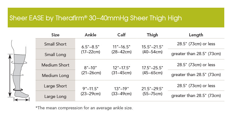 Sheer EASE by Therafirm closed toe Thigh highs 30-40 mmHg is a Sheer Super Soft, breathable material, with all day wear and comfort. Delivers a controlled amount of Pressure greatest at the ankle and gradually decreases towards the top of the stockings, to help promote better blood flow.