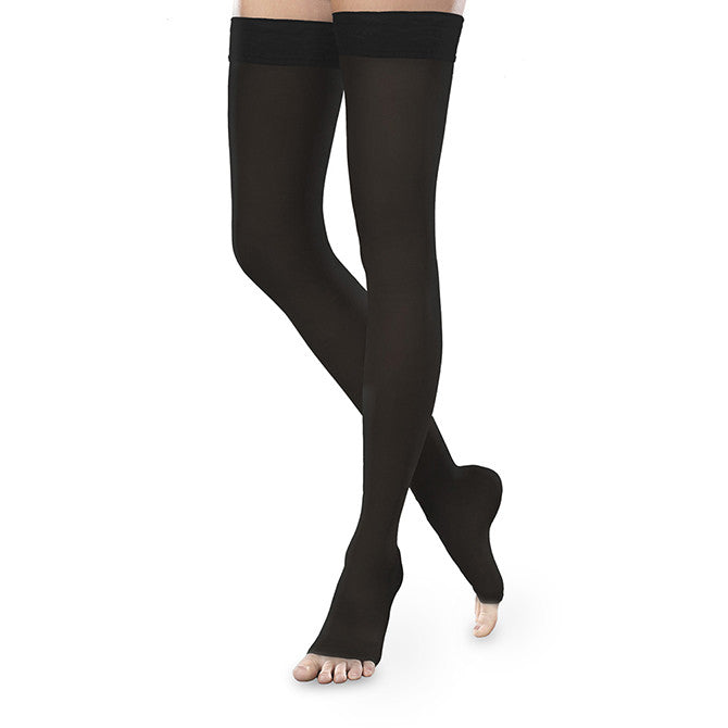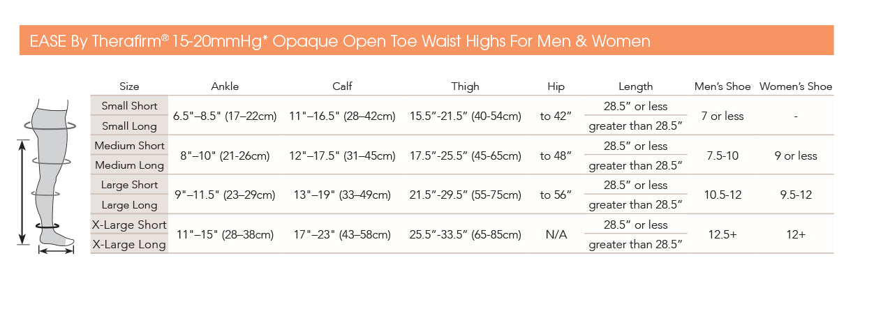 Sheer EASE by Therafirm open toe Thigh highs 20-30 mmHg, is a Sheer Super Soft, breathable material, with all day wear and comfort. Delivers a controlled amount of Pressure greatest at the ankle and gradually decreases towards the top of the stockings, to help promote better blood flow.