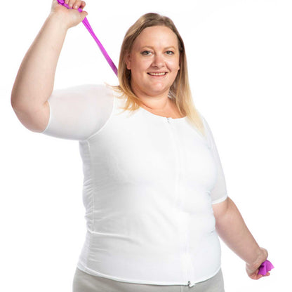 This garment provides both comfort and effective relief for swelling caused by lymphedema or edema. The sewn-in axilla pads are especially convenient for sleeping, eliminating the need to worry about keeping them in place.