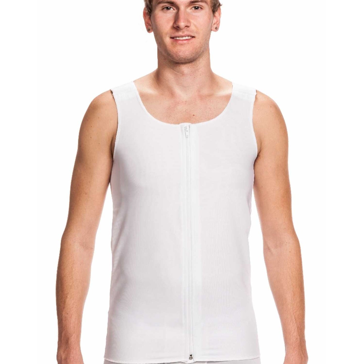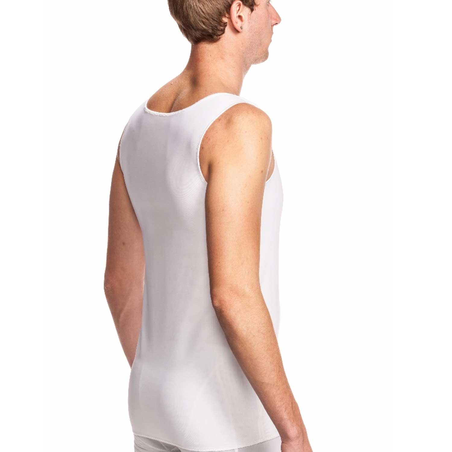 The Wear Ease Men's Compression Vest is perfect for various procedures such as male breast cancer surgery, male chest reconstruction, gynecomastia treatment, and cardiovascular/thoracic surgery. It boasts a front zipper with hook and eye closure, as well as a spacer placket underneath for skin protection. Additionally, it has wide, adjustable, and detachable shoulder straps with hook and eye attachments. Made with a double layer of breathable and moisture management powernet fabric, this vest provides full-length coverage for the torso.